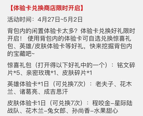 每个召唤师的背包里都有很多闲置的体验卡,放着没用,扔了又可惜。这次五五开黑节开启限时体验卡兑换亲密玫瑰活动,小伙伴赶紧清理一下背包吧!