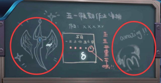 首先左侧图案是一把刀,上下两侧各有一颗星,代表的是刀客和“星”的魔道家族,而刀柄中间写了一个K,代表的是铠而非露娜。所以这指的是铠的开黑节专属皮肤:曙光守护者,这款皮肤原画已经曝光,下文会为大家揭晓。右侧有一个amazing,代表的是惊讶和惊喜的意思,下方有一个牛角且有m的标志,这指的是牛魔的6元限定皮肤:制霸全明星,这款皮肤已经在商城中出售。其实黑板上还有一个细节部分,在正中央的日历上,有三个粉红色的点和三个白色的点,白色的三天也许指的是开黑节持续三天。