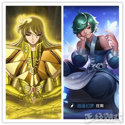 处女座的沙加是最早领悟并能够自力不依靠女神雅典娜之血觉醒一瞬间第八感,被誉为“最接近神的人”平时靠紧闭双眼来修炼自己的小宇宙。王者荣耀中同样有着一个常年紧闭双眼的英雄,那就是庄周,庄周尽管是在王者峡谷中战斗的时候依然紧闭双眼,而沙加则一样,面对着星矢等人的到来同样临危不乱。在动漫中,凤凰座一辉的技能都对沙加无效,很容易就让人联想到庄周的被动——自然意志,两人的相似之处不言而喻。