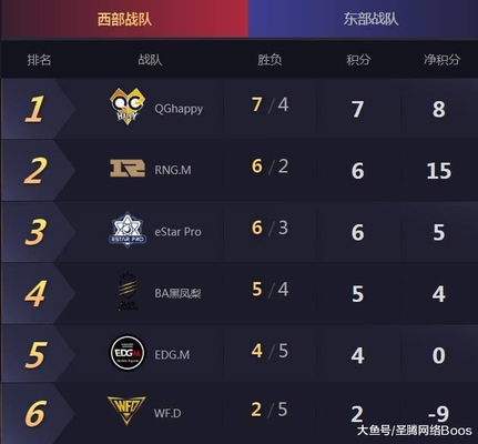 东部地区的排名就没有像西部一样有点小差距,分数线都差距并不是很大,QG战队领先一分,然而RNG.M战队净积分却相比较高(排名的话,先看积分,积分相同看净积分,净积分也相同就看两个队的胜负关系)所以 压力还是有的!