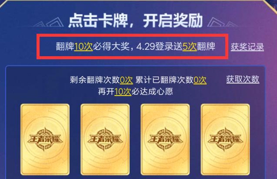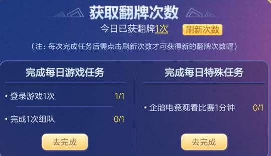 许愿活动每日只能翻牌三次,每次翻牌都需要完成任务,任务分别是:登录游戏、组队实战以及每日更换的特殊任务。这个特殊任务就有点坑了,跟王者荣耀似乎没有关系。