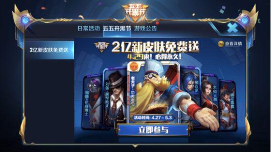 活动入口:游戏大厅——活动面板——五五开黑节——【2亿新皮肤免费送】