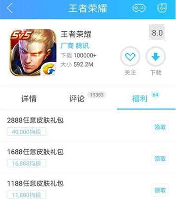 好消息!使用玩GO APP搜索王者荣耀,点击礼包既可免费获得2888、1688等高级皮肤礼包。