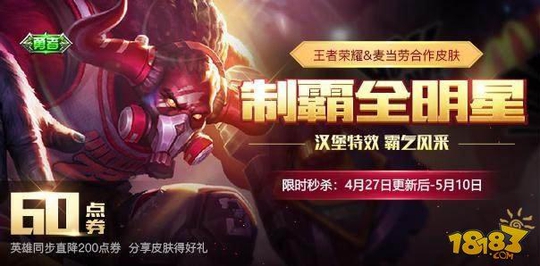 制霸全明星只需要60点券就可以带回家,又一款福利皮肤正式出售,而且附带汉堡在飞的技能特效,但颜色特效就很勉强,不过也是一款很划算的新皮肤。