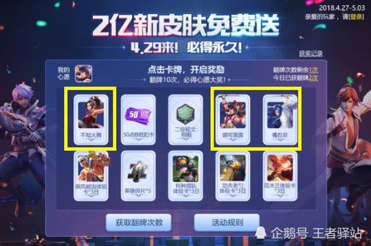 必得皮肤的条件很简单,玩家只需在今天至下个月3号期间翻牌十次即可,翻牌次数可以通过参与任务获得,其中周日(29号)一天就能获得12次翻牌机会,若是嫌麻烦的玩家可以在当天做满任务!另外每次翻牌也有机会获得心愿奖励、点券抵扣卡、英雄碎片和皮肤体验卡哦,比如开出不知火舞、橘右京等!