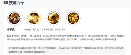 b、一技能甩出一个气功波,这个气功会附带敌人当前生命值百分比的伤害。这个技能伤害不高不低,一般在实战里是用作衔接技能用的,减速敌人再配合红BUFF,追着普攻风筝着打。