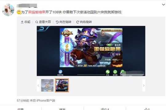 先来看看第一位玩友直接花了100大洋抽到了李元芳的皮肤,还不知有没有抽到阿轲的1元皮肤呢。当时如果黑猫爱糖果这款皮肤下次6元返场的话这些玩家该咋想。