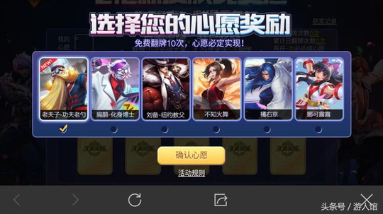 在参与之后就会选择你的心愿奖励了,默认的就是老夫子的功夫老勺,我个人建议也是让大家选择他。其他几个皮肤和英雄在之后的一些活动中也可以得到的。