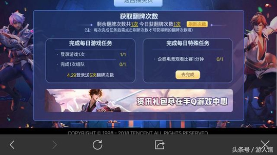 这就是我刚才说的获取翻牌次数的界面,大家可以看到左边有两个每日的游戏任务,其中一个是登录游戏,一个是完成组队,这个应该每天都是一样的。而右边的特殊任务则会每天都进行变化。这里提醒大家一一下,如果不想耗费太多时间做任务的话,那么4月29号一定要登录,因为那一天登录可以得到5次翻牌次数,这样光是登录奖励,基本上都够大家翻够十张牌了。