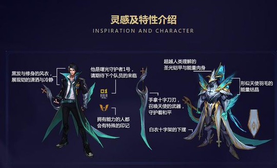 先来看看灵感和特效介绍,在下图展示中铠没开大招之前是黑发加修身的风衣,非常潇洒帅气,而开大招之后全身覆盖的是圣光铠甲,周围有形似天使羽毛的能量结晶覆盖。