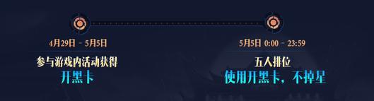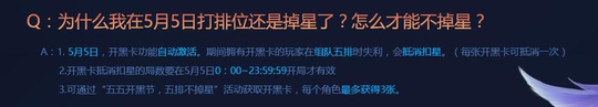 5月5日,当你五黑排位失败时,只要拥有道具“开黑卡”,系统就会自动触发“排位不掉星”机制哦!是的,你没有听错,五五开黑节,排位不掉星!