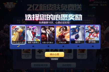 2018年4月27日至5月3日,只要登录游戏,即可在活动版面的6个永久英雄/皮肤中选择一款作为自己的终极心愿奖励。通过完成任务可以获取翻牌抽奖机会,累计翻牌次数达到10次,必得心愿大奖哦!