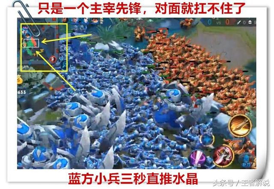 但是,如果双方就这么一直打下去王者解说真的不知道什么时候才能打完,所以就偷偷去拿了一直主宰,然而,真的只是一个主宰先锋而已,局面瞬间就改变了。蓝色王者解说入潮水一般直接冲毁了红色王者解说的阵营,然后真的只用了三面就直接打爆了对方水晶哦。两个小时候后的兵线,威力真的完爆任何神装英雄了。不过,以你为这就完事了吗?看看下面这张图。
