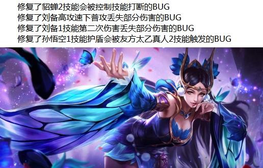 修复貂蝉2技能被打断的BUG,对貂蝉来说,英雄强度会有所提高,2技能将无法被打断。另外刘备和孙悟空的BUG也有修复,同时也会提升这两个英雄的强度。