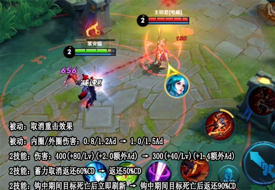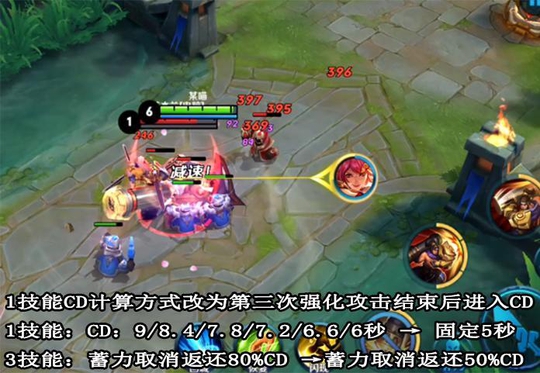梦奇移速略微提高,特别是最胖状态下提高了40移速,不过一技能的消耗大幅度提升,满质量只能释放两次,不过普攻回复速度加快。大招取消后的返还冷却时间降低。