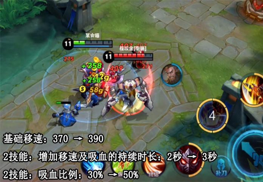 典韦削弱了基础移动速度二十点,但是二技能全面加强,吸血比例高达一半,相当于自带两把半泣血之刃的效果,并且持续时间提高了一秒,爆发能力和生存能力都大幅度上涨。