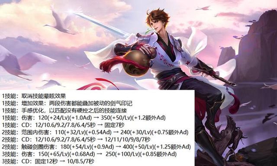 官方认为李白这位技巧性的刺客模板有些问题,比如说李白1技能的硬控晕眩会挤占其余控制职业的出场空间,但同时官方也承认李白的强度在当前版本是过低的,所以对李白的伤害进行了大幅度的提升,同时也将李白的硬控晕眩取消,并修改了李白大招释放机制,1技能的2段伤害也可以叠加被动的剑气印记了!