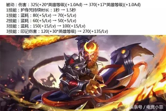 前阵子被削弱的猴子今日又迎来增强,不晓得官方是怎么想的,一技能近身护咒增加0.5秒,2技能耗蓝降低,同时大招伤害翻倍,这对于爆发能力超高的猴子来说是非常可怕的。