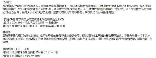 点评分析:苏烈更改了一技能的释放方式。之前的存技能连续强化普攻六连发再也不存在了。大招的取消返还时间也遭到了降低,这样一来,苏烈的控制能力就弱了很多。至于典韦,这一次的加强没什么卵用。增加移速增加2技能的吸血能力,都只能说是花瓶,典韦玩的就是拼,大招一出不是你死就是我死。