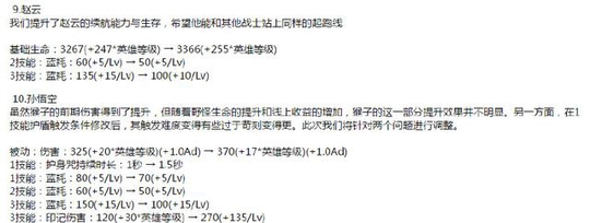 点评分析:赵云的调整主要是蓝耗方面的,对于赵云费蓝的情况应该说会有一定缓解的作用。至于猴子,新版本的时候已经对猴子进行过一个修改,主要是加强了他的前期能力。这一次也是一样,把前期的能力再加强。这让猴子在前期的时候能够有比较高的伤害,不至于太疲软。对于猴子来说,这是一个福音。