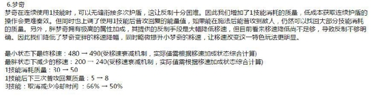 点评分析:梦奇本身依靠一技能的护盾,可以抵消大量的伤害,而且一技能的释放频率非常高,造成梦奇非常肉的情况。这次的修改可以说是大大打击了梦奇。