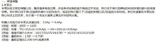 接下来说说其他在这次更新中也被调整的英雄。第一个是马上就要上线的米莱狄,近来的改动比较频繁,应该说是做最后的调整了。