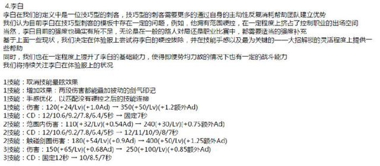 点评分析:李白一技能的修改,让李白变得抓人非常无力,因为没有了控制!而换来的是伤害的提升以及可以叠加普攻次数的效果!这意味着李白对打野刷大招的依赖程度将大大降低,一技能的叠加印记可以让李白快速的刷出大招,应该说李白刷出大招过去队友却已经死了的尴尬情况会有所缓解。但是玩李白的同学都知道,一技能的两段眩晕是非常霸道的,不但能断技能,而且具有打击感,所以用起来非常有感觉。但是现在一技能去除了控制效果,可能会变得手感没那么好,不过天美已经考虑到这一点,说会做手感优化,实际怎么样就要各位上手才知道了。二技能和三技能的改动,我感觉就是为了调整一技能而作出的配合,给予了李白更强的伤害,这个伤害应该说一套下来,秒人是非常轻松的了。