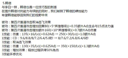 点评分析:对于韩信来说,这可能是一个致命的打击!居然取消了韩信的击飞能力!韩信的三连飞再也不存在了!只剩下一技能的挑飞了!给个不痛不痒的回复,顶多就是增加了续航能力,但是说实话,一个410的小吸血刀都能解决的问题,这个效果完全就是鸡肋,估计这个改动对于玩韩信的玩家是相当大的一个打击啊!