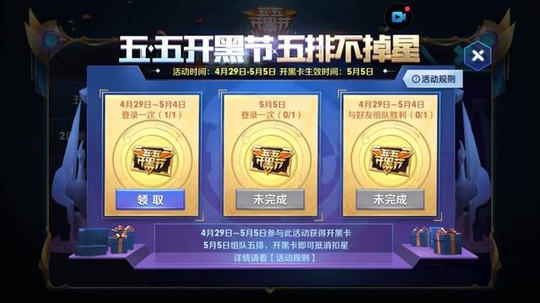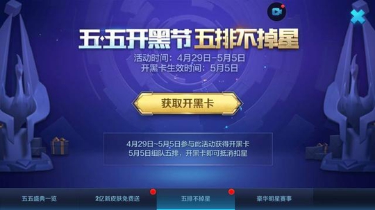 在4月29日至5月5日活动期间,玩家只需要完成3个任务即可以获得五五开黑节专属道具“开黑卡”。开黑卡在5月5日当天自动激活,五排开黑排位赛输掉游戏时,会抵消掉黑卡,不掉分。