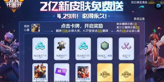 活动时间为4.27至5.3,在活动期间内可以完成任务获得翻牌次数。在4月29日当天参与活动可免费获得永久皮肤,4.29当天最多可以获得12次翻牌次数,而活动规定,只需要翻牌10次,必得自己心愿奖励。