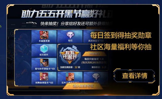 在4.23至5.5活动期间,玩家可以通过“助力五五开黑节赢好礼”页面签到、分享助力和每日一题等方式来积攒抽奖勋章。
