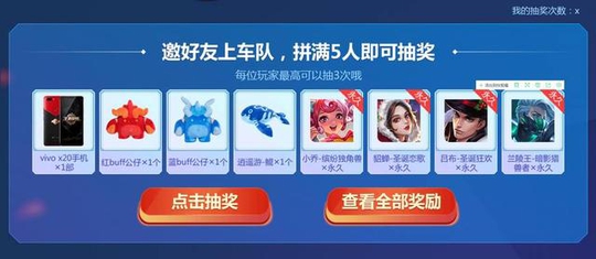 在4.25至5.9活动期间,王者荣耀玩家在活动页面通过分享邀请好友上车五排开黑,当邀请满5人时,可以获得一次免费抽奖机会,每个账号最多可获得三次抽奖机会,奖励包括实物手机、公仔和游戏奖励小乔、吕布、貂蝉和兰陵王等英雄的永久皮肤。