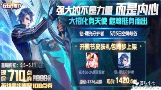 目前铠的“曙光守护者”皮肤价格已经曝光,其实大家都能猜出这个价格,去年花木兰的水晶猎龙者首周710点券,这次铠的“曙光守护者”首周同样是710点券,不过去年的五五开黑节专属皮肤是水晶猎龙者,单买要888点券,2个皮肤一起的礼包1420点券,所以划算点点。