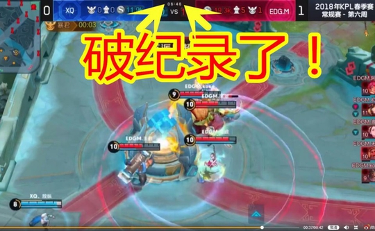 第二局是kpl职业联赛里最快结束的一局,前期野区爆发两场团战,EDGM都是取得了优势,分别击杀了XQ的2人和3人。经济和防御塔优势也非常之大。最后一波,EDGM进攻中路,牛魔一个大招大住多人,XQ直接团灭。EDGM强上高地点破水晶,比赛结束的时间是6分46秒。这是KPL职业赛场上的一个记录。