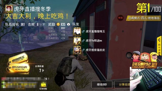 这时,除了自己的队伍以外,只剩下最后一个敌人。细心地鸡友可以观察到,冬季这时的血条并没有加满。因为,之前的对攻大战已经把冬季的急救包和能量用完了。这还不是最难受的,冬季完成七杀赶到决战场地时,自己的队友已经全部倒下。一波刚枪,冬季也被打成残血。最后,冬季在队友的提示和自己老道的卡位骗子弹后,用AKM淘汰对手,8杀吃鸡。