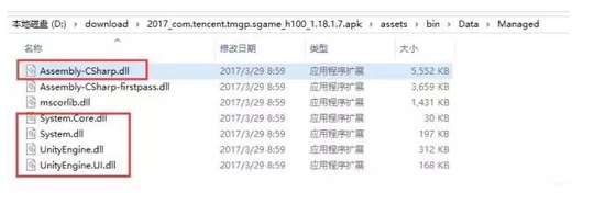 2017_com.tencent.tmgp.sgame_h100_1.18.1.7.apkassetsinDataManaged,C#程序员肯定熟悉文件里面的各种dll了 UnityEngine.dll、System.dll、System.Core.dll、Assembly-CSharp.dll