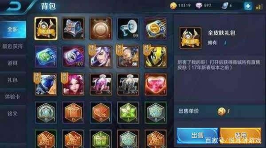 直到悦耳看到这张截图后,才知道为什么这位玩家称自己赚了1千元,全皮肤礼包啊,这个道具使用后,就能获取上场中所有直售皮肤(2017年新春版本之前),可以说是个非常逆天的道具了。估计这位玩家的朋友肯定是没玩过王者荣耀,所以不知道这个道具的价值,才同意200元出售的吧,否则怎么可能200元卖掉。