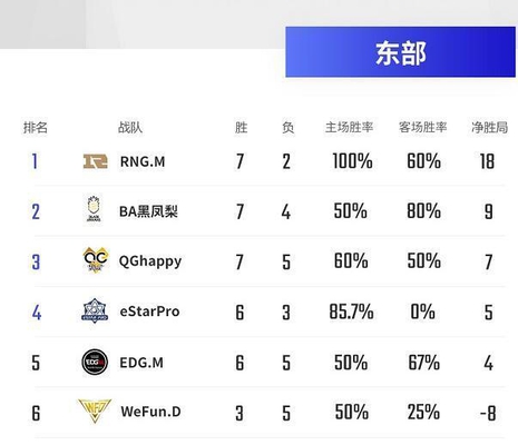 再来看看东部,东部可以说就是完全乱成一锅粥啊。大家可以看到,前五名之间的胜场只差了一场,就算是现在排名第五名的EDGM,他们这个战绩,如果拿到西部去的话,也是妥妥的第二名。