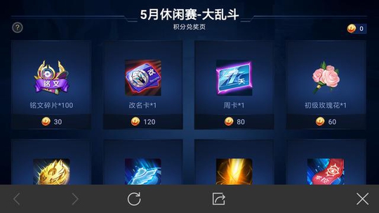 而月赛和休闲赛是同一个奖池,里面没有永久英雄和永久皮肤,但是有改名卡和周卡,周卡是每天领取钻石,需要改名卡的豹子头“零冲”,倒是可以参与这个大乱斗锦标赛。