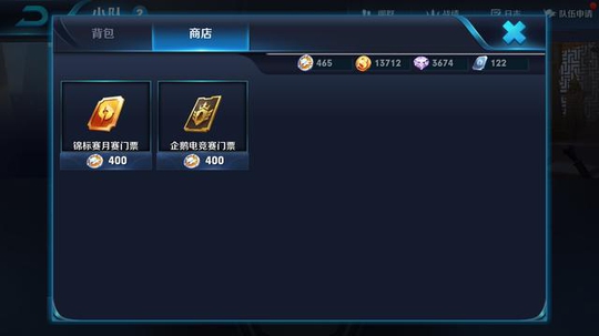 开黑赛和休闲赛的报名都需要门票,而且必须是以小队的形式参与,也就是必须五黑。这个门票在小队商店里有售卖,在小队界面点击全部门票或背包,即可看到商店出售两类门票,商店的货币是通过小队任务获得。另外开黑赛的门票,在活动面板上有一个活动可以免费获取,只需要小队参与实战,即可每日获得一张。