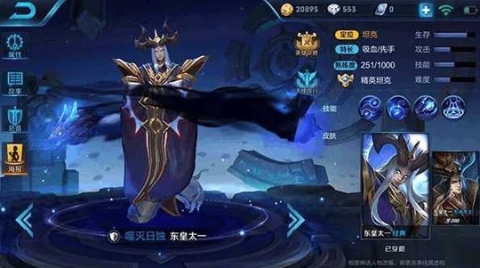 东皇太一的回复能力在王者峡谷中是比较罕见的,被动的回复能力和消耗能力能使其在线上面对多个近战英雄时毫不惧色,大招的特殊机制使得东皇太一需要出大量增加生命值的装备,来增加自己的生存能力和大招的秒人能力。对线期,东皇太一可凭借着大招的特殊效果,配合队友轻松的越塔杀人。后期团战可以冲进人群,先手控制住关键敌人,用自己来换掉敌方关键敌人,从而带来团战的胜利。