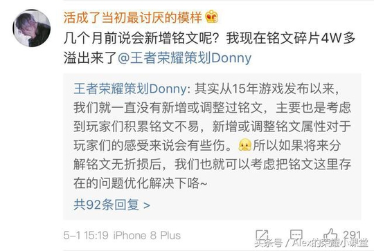 今天官方策划在微博上提到了:分解铭文不再有折损,以后购买铭文需要多少碎片,那么分解铭文也会获得同样数量的碎片。