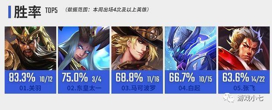 出场率高并不能代表很厉害,但是又有出场率,而且胜率还很高的英雄是相当的可怕,王者荣耀职业联赛第六周,胜率排行榜第一的居然是他,更没想到的是第二名,只出场了4场比赛就赢了3场。