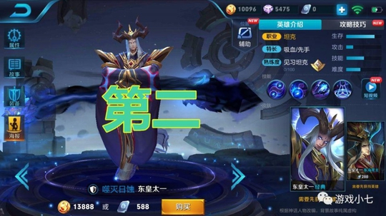 排在胜率榜第二位的是东皇太一,他在王者荣耀职业联赛第六周只上场了4次,却胜利了3次,胜率高达75%,没办法,能选,苏烈,太乙真人,张飞,东皇太一大招群控差了点。