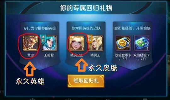王者荣耀在吃鸡游戏持续火爆的这段时间,可以说是把拉走了很多的游戏玩家,天美也推出了一系列挽回的活动。其中最重要的一个就是回归礼包,只要一个玩家15天以上的时间不玩,在你下次登录的第一时间官方就会赠送一个回归礼包。礼包里面每个玩家必有的就是7天的双倍经验卡和双倍金币卡,可以说是非常良心的了!