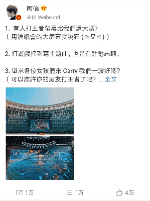 阿信更是微博上好好的秀了一把:”有人打王者荧屏比我们的还大吗?“那是相当的傲娇啊。“打游戏打到写主题曲,也是有点励志啊。“的确是励志,小编打游戏只能打到头皮发麻。