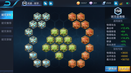 后羿铭文:蓝色:6狩猎+4夺萃,绿色:6鹰眼,红色:6祸源+4无双。