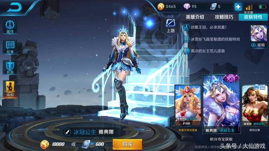 至于这里要提到的第二款皮肤,那绝对是土豪的真正象征。这个皮肤就是雅典娜的史诗级皮肤冰冠公主。这个皮肤的获取方式仅仅限定在积分抽取才能获得。之前就在网站有看到这么一篇报道,有玩家积分抽奖就是冲着这个皮肤来得,结果半路提前没花多少钱,抽到了荣耀水晶,结果反而不开心了。因为这位玩家几乎拥有了王者荣耀英雄池的所有英雄和所有皮肤,当然也包括了武则天,所以荣耀水晶对于这样的玩家来说反而是摆设了。那是唯独一个皮肤没有,那就是这个即将下线的冰雪皇冠。这也能体现这个皮肤的珍贵性,无疑拥有了这个皮肤的人真的是非富即贵了。