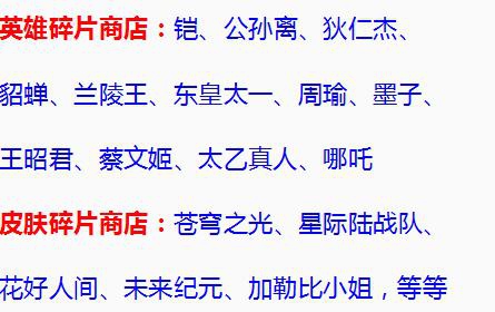 在英雄碎片商店中,铠、狄仁杰、貂蝉、蔡文姬、东皇太一可以兑换,其他英雄有点过时了,也不是很强势。而在皮肤碎片商店中,并没有特别出色的皮肤上架,苍穹之光售价2888点券,需要288个皮肤碎片兑换,虽然特效还可以,但兑换起来很亏。官方并没有公示其他15款更新皮肤,没有办法给大家预览,只能更新后在商店中自行查看。