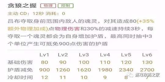 技能解析:吕布对身前的敌人造成伤害,并减速敌方,同时为自身增加护盾。这是吕布的留人技能,也增加坦度的技能。技能命中的敌方目标越多,护盾值越高(有上限),所以尽量选择在有兵线时开战。